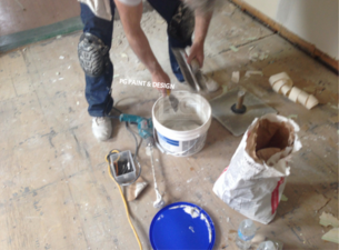 - Drywall compound is mixed for drywall repairs of ceilings and walls before painting